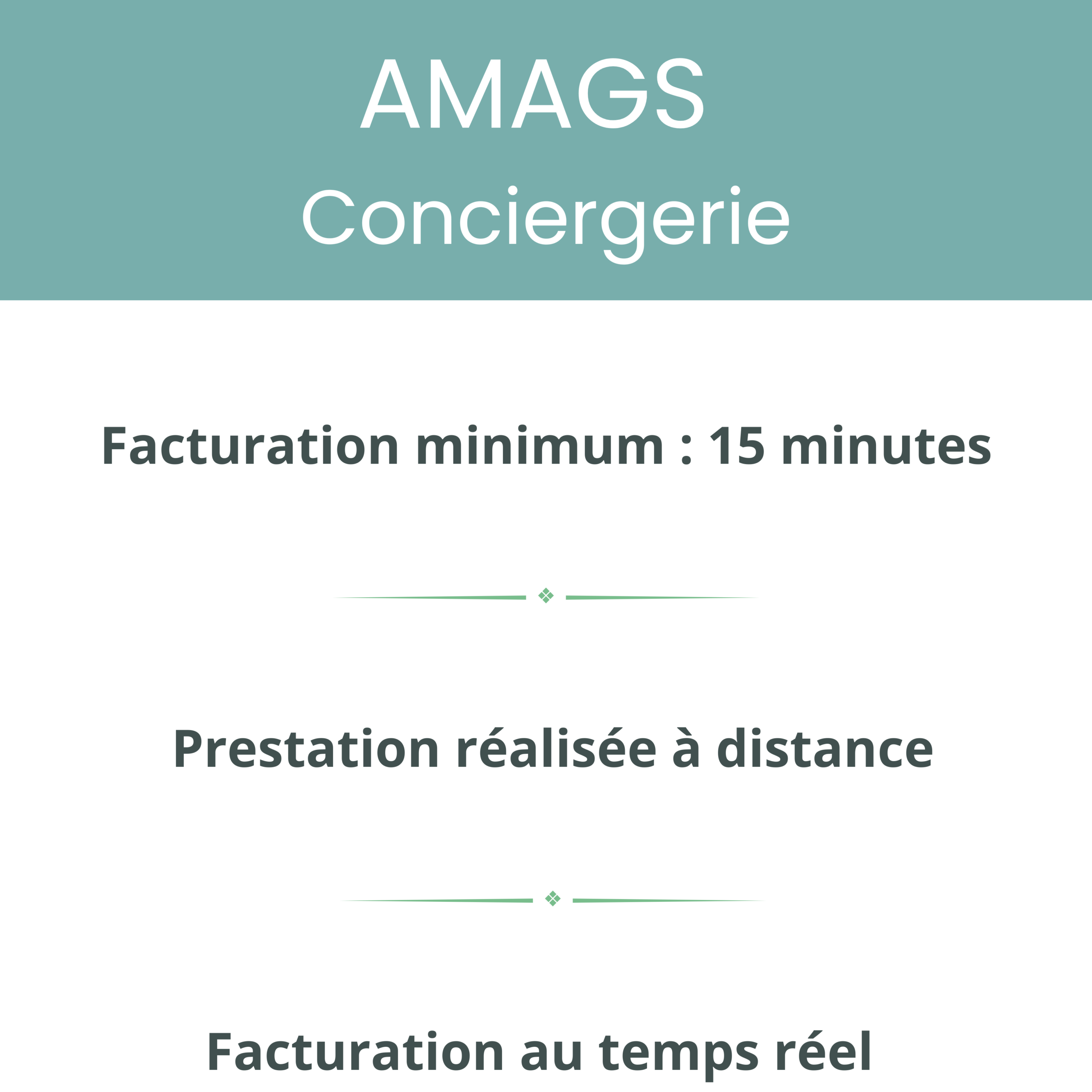 La facturation minimum pour toute prestation AMAGS – Conciergerie est de 15 minutes soit 13 € TTC (par exemple : prise d’un rendez-vous médical, transmission des informations et rappel du rendez-vous).