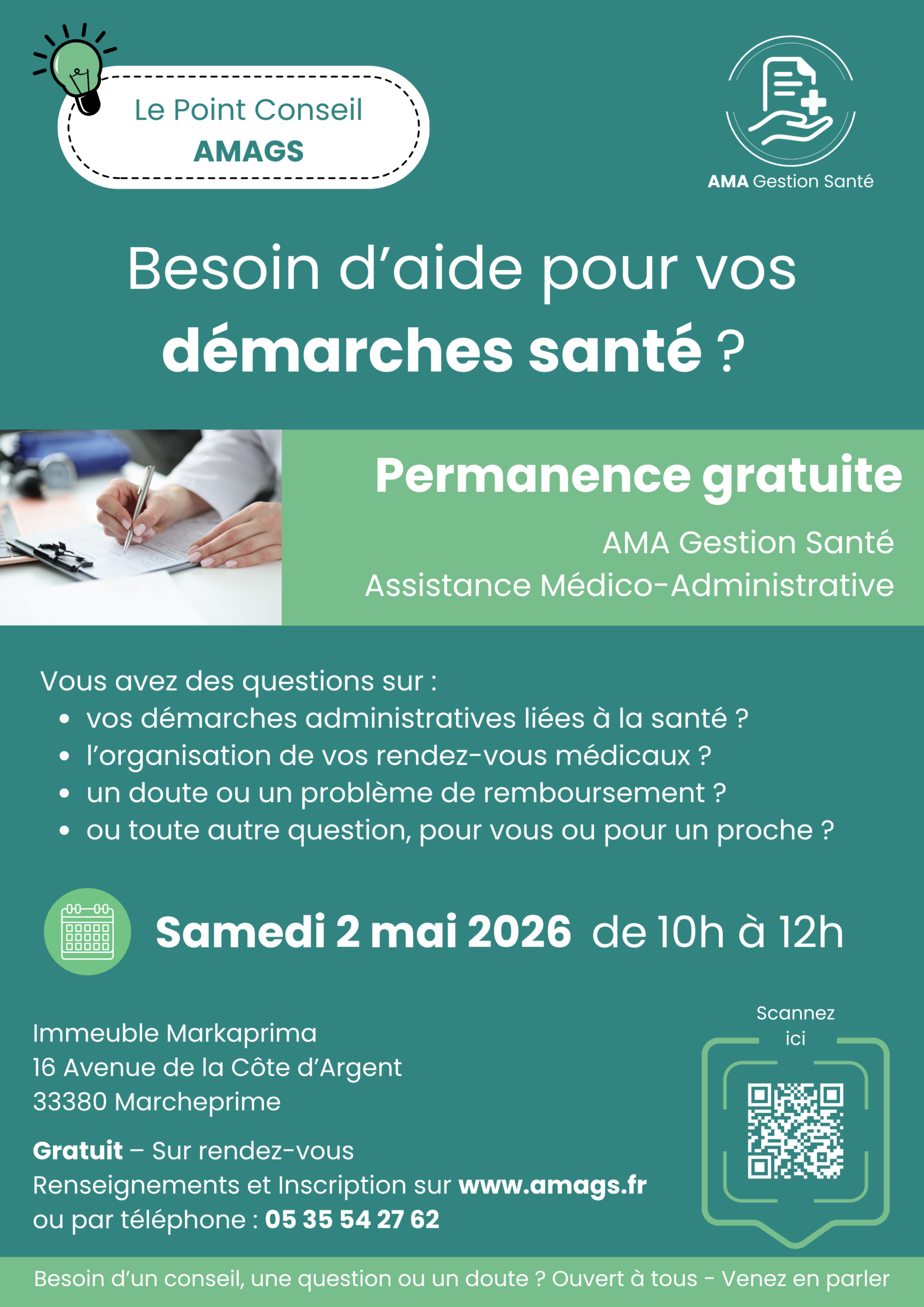 Le Point Conseil d’AMAGS est une permanence gratuite à Marcheprime pour vous aider dans vos démarches Santé.